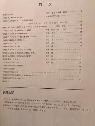 | 創刊号 | 1985.9 | 宮崎植物研究会の発刊にあたって 中山至大 日南海岸幸島の植物調査報告 A.幸島の植生 河野耕三 B.幸島のフロラ (代表) 南谷忠志 種子の色について(1) 井之口希秀・中山至大 ムジナノカミソリ日南市に産す 南谷国合郎 鬼の目山の天然スギ自生地群落に関する緊急報告書 (河野耕三) オオヤブツルアズキは宮崎に産するか 斉藤政美 採集記録 井上伸之 本県初記録、ミツバテンナンショウを採集 井上伸之 カンアオイ属(Heterotropa)の新雑種(1) 南谷忠志 風蘭 永峯麗子 1984年度活動記録 |